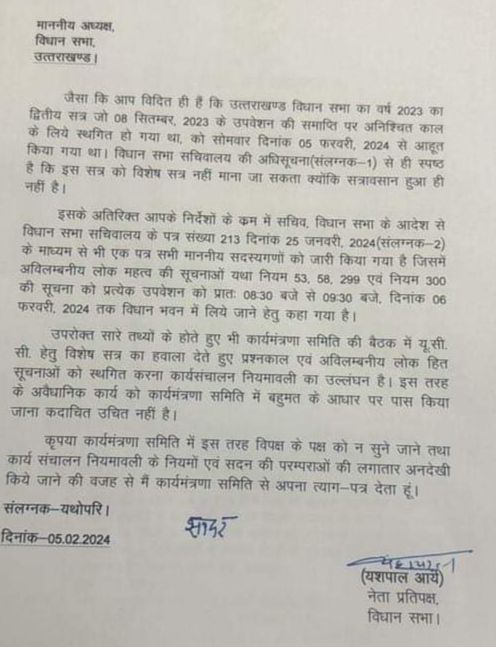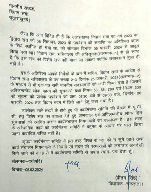 देहरादून। कार्यमंत्रणा समिति में विपक्ष के पक्ष को न सुने जाने तथा कार्य संचालन नियमावली के नियमों व सदन की परंपराओं की लगातार अनदेखी किये जाने पर नेता प्रतिपक्ष श्री यशपाल आर्य और वरिष्ठ विधायक प्रीतम सिंह ने विस अध्यक्ष को कार्यमंत्रणा समिति से अपने त्यागपत्र सौंप दिये।