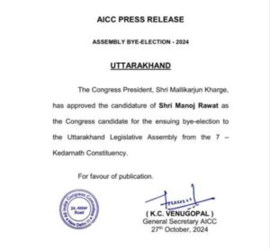 केदारनाथ मे 20 नवंबर को उपचुनाव होगा। दूसरी ओर भाजपा ने अभी प्रत्याशी फाइनल नही किया है। उम्मीद है कि आज शाम या कल तक भाजपा भी प्रत्याशी फाइनल करेगी।