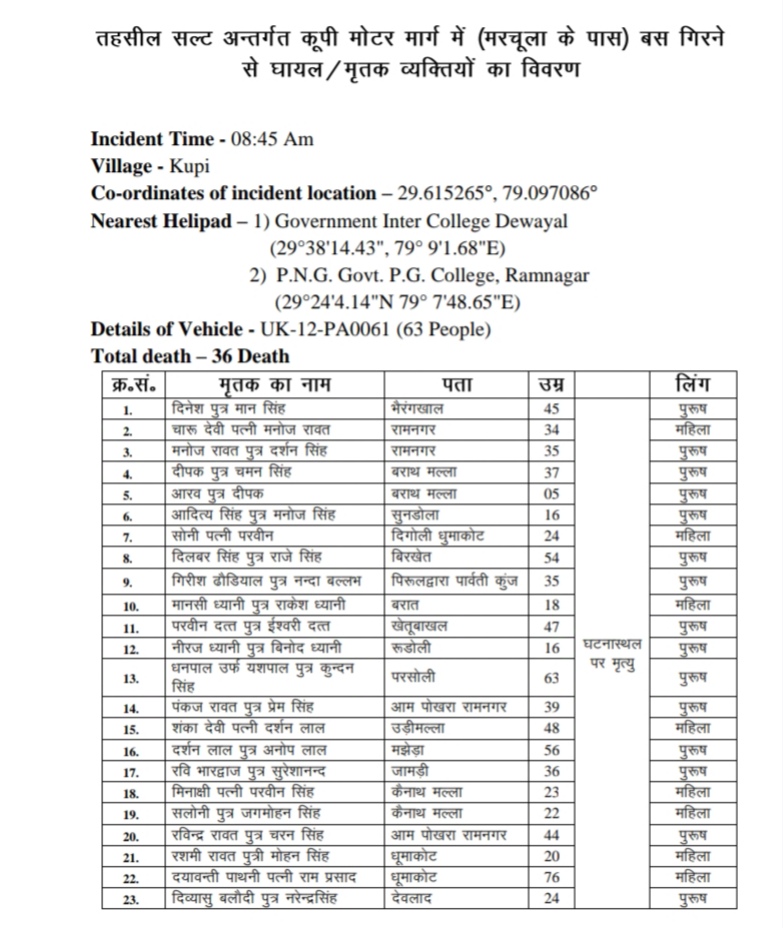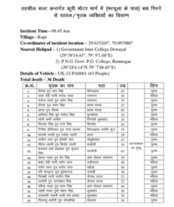 ओवरलोड बस मे थे 63 यात्री, 36 मरे, 27 घायल, सूची जारी