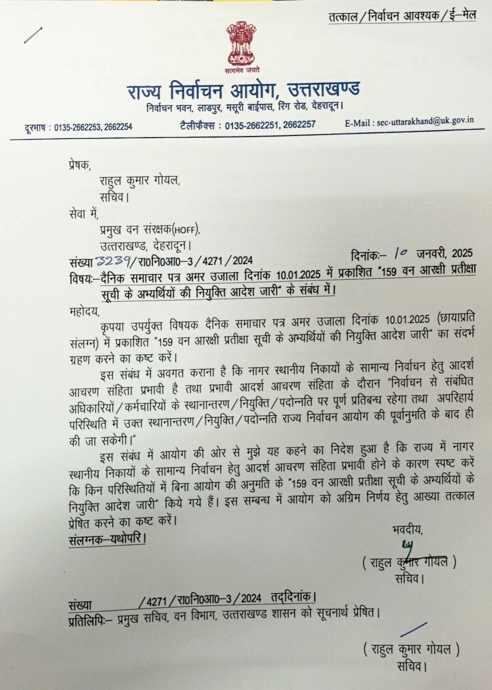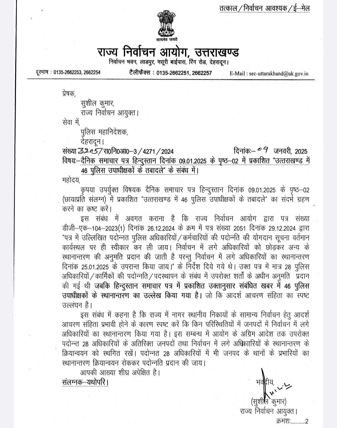 देहरादून। राज्य निर्वाचन आयुक्त सुशील कुमार ने नागर स्थानीय निकाय सामान्य निर्वाचन 2024 हेतु आदर्श आचार संहिता प्रभावी होने के दौरान तबादले एवं नियुक्ति प्रक्रिया जारी रखने पर पुलिस एवं वन विभाग से स्पष्टीकरण तलब किया है।