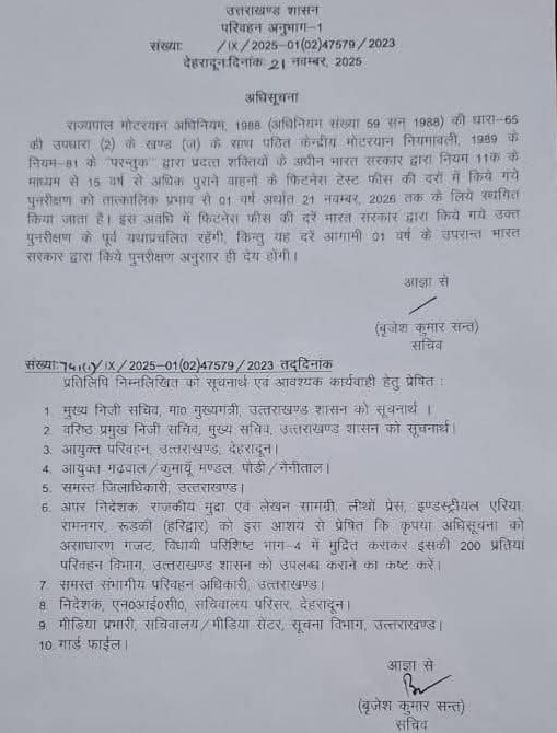 देहरादून। मुख्यमंत्री पुष्कर सिंह धामी के निर्देश पर राज्य सरकार ने उत्तराखंड के वाहन स्वामियों को महत्वपूर्ण राहत प्रदान करते हुए पुराने (15 वर्ष) कमर्शियल वाहनों की फिटनेस फीस में वृद्धि को आगामी 01 जुलाई 2026 तक स्थगित कर दिया है। इस संबंध में परिवहन विभाग द्वारा अधिसूचना जारी कर दी गई है। अधिसूचना सचिव परिवहन श्री बृजेश कुमार संत द्वारा जारी की गई।