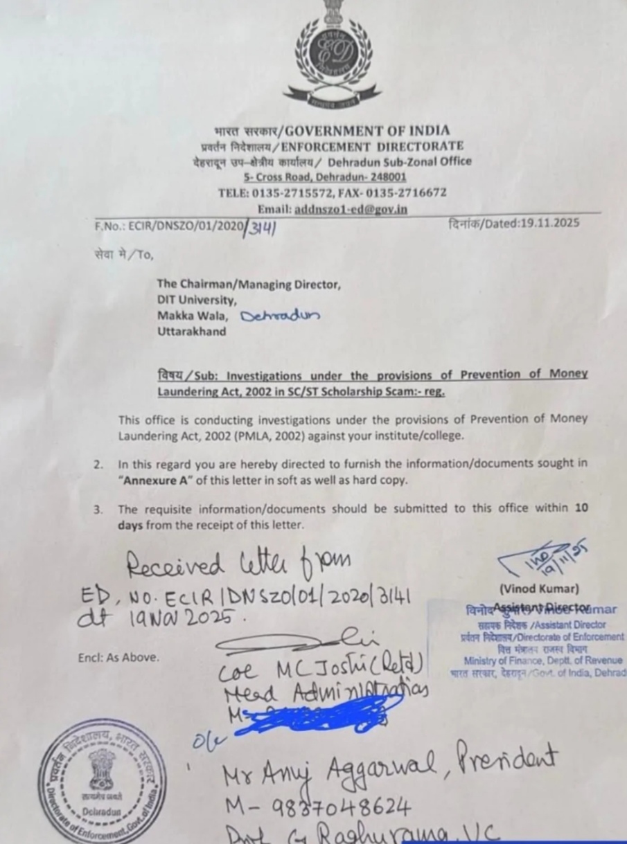 देहरादून। उत्तराखंड में चर्चित छात्रवृत्ति घोटाले की आंच अब बड़े संस्थानों तक पहुँच रही है। ईडी ने डीआईटी यूनिवर्सिटी के चेयरमैन अनुज अग्रवाल को नोटिस जारी करते हुए उन्हें 10 दिन के भीतर स्पष्टीकरण प्रस्तुत करने के निर्देश दिए हैं। नोटिस में उनसे संस्थान द्वारा प्राप्त छात्रवृत्ति राशि, लाभान्वित छात्रों के वास्तविक डेटा और वित्तीय लेन–देन से जुड़ी विस्तृत जानकारी मांगी गई है।