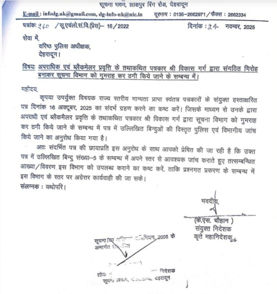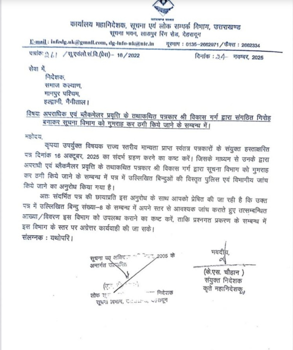 देहरादून। पत्रकारिता की आड़ मे प्रदेश मे कूटरचित दस्तावेजों के जरिये सरकारी विभागों को चूना लगाने के कई मामले सामने आ रहे हैं। एक ऐसे ही मामले मे प्रदेश के वरिष्ठ पत्रकारों की शिकायत का गम्भीर संज्ञान लेते हुए राज्य सूचना विभाग ने देहरादून के जिलाधिकारी, वरिष्ठ पुलिस अधीक्षक व समाज कल्याण विभाग (हल्द्वानी मुख्यालय) को शिकायत–पत्र भेजकर जांच की संस्तुति की है।