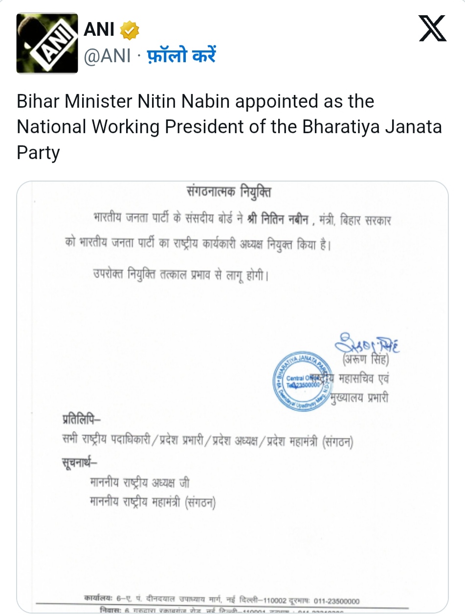 बीजेपी के राष्ट्रीय महासचिव अरुण सिंह ने कहा कि भारतीय जनता पार्टी के संसदीय बोर्ड ने बिहार सरकार में मंत्री नितिन नबीन को  भाजपा का राष्ट्रीय कार्यकारी अध्यक्ष नियुक्त किया है।