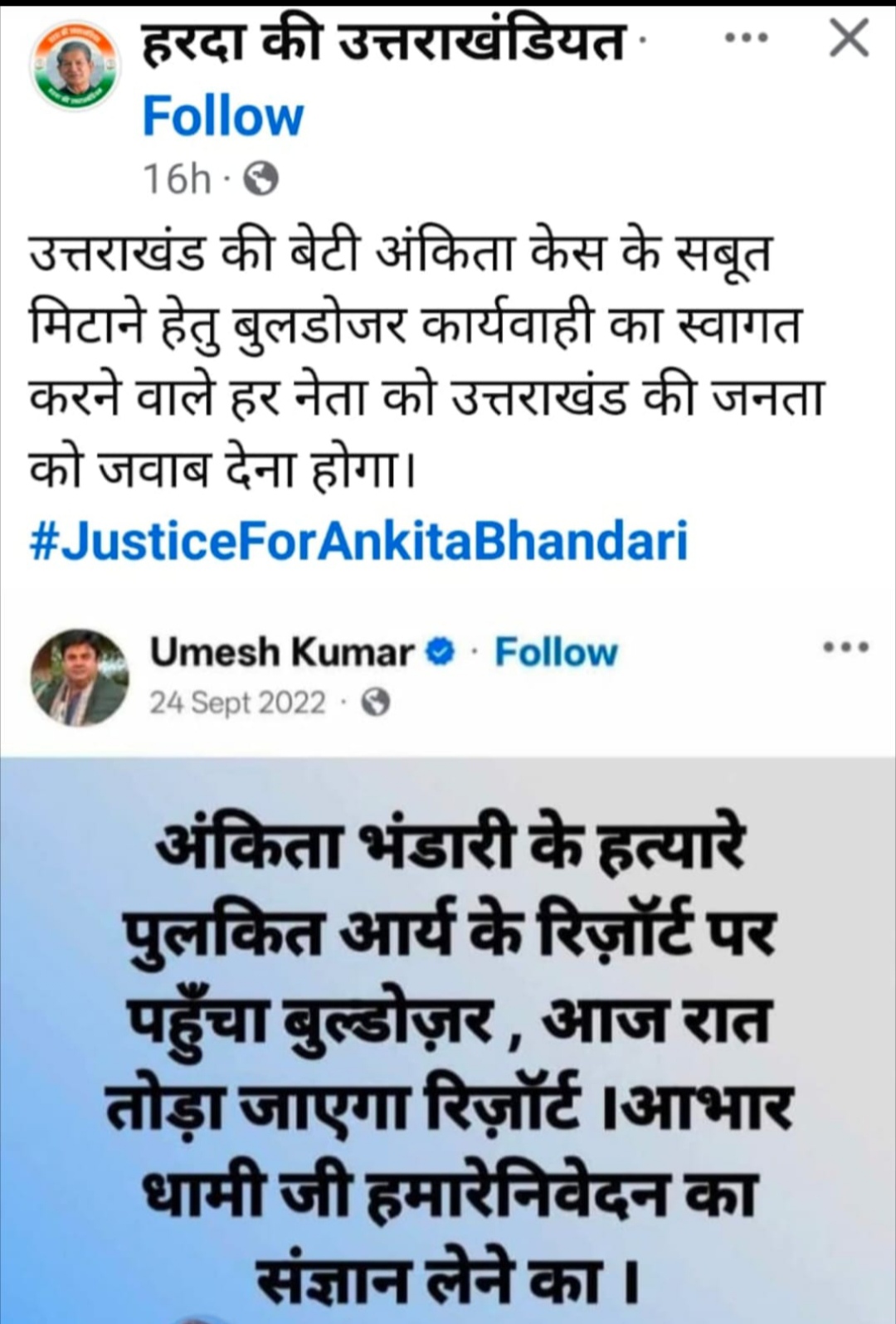 “अंकिता भंडारी के हत्यारे पुलकित आर्य के रिज़ॉर्ट पर पहुँचा बुल्डोज़र, आज रात तोड़ा जाएगा रिज़ॉर्ट । आभार धामी जी हमारे निवेदन का संज्ञान लेने का।”
