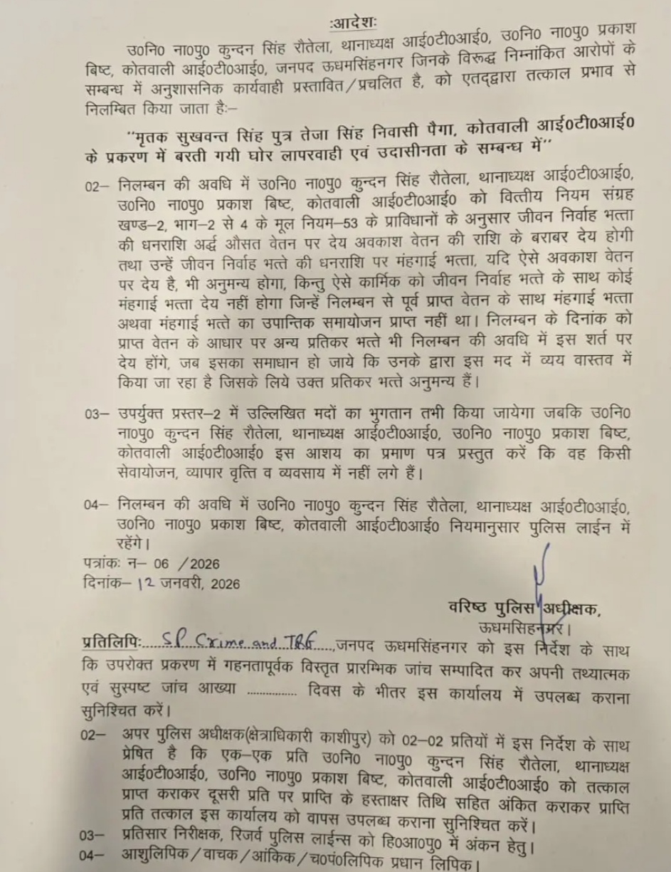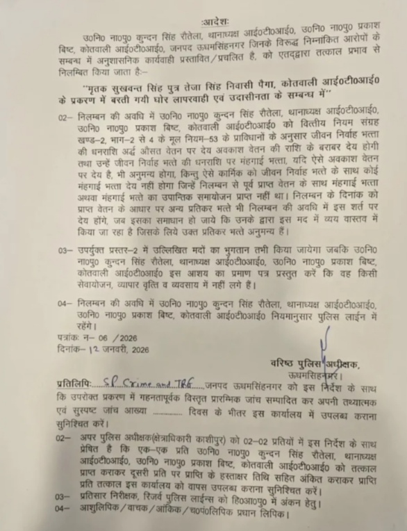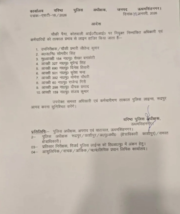 इस पूरे मामले की गहन एवं विस्तृत प्रारंभिक जांच के लिए एसपी क्राइम एवं टीआरजी, ऊधमसिंहनगर को निर्देशित किया गया है, जिन्हें निर्धारित समयसीमा में तथ्यात्मक एवं स्पष्ट जांच आख्या प्रस्तुत करनी होगी। वहीं, चौकी पैगा, कोतवाली आईटीआई पर तैनात कुल 10 अधिकारी एवं कर्मचारियों को तत्काल प्रभाव से लाइन हाजिर कर दिया गया है। सभी को पुलिस लाइन्स, रुद्रपुर में तत्काल आमद करने के निर्देश दिए गए हैं।
