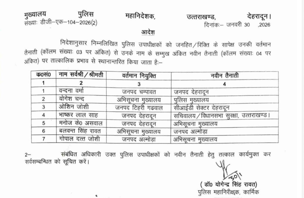 देहरादून। पुलिस महकमे मे कई अधिकारियों के तबादले किये गए है।