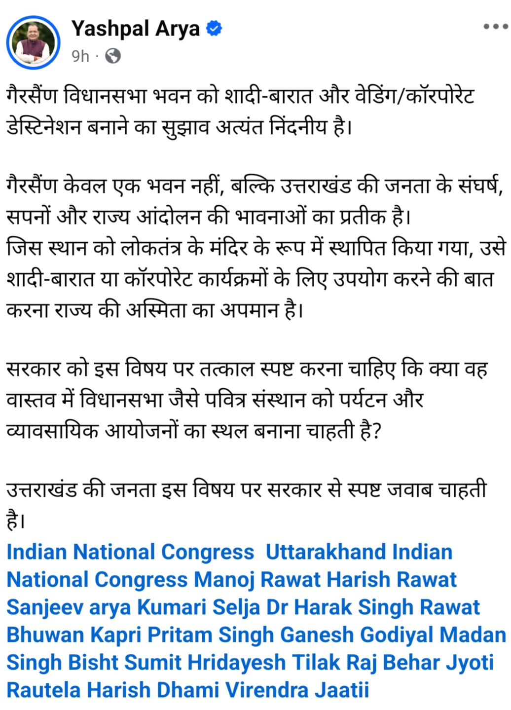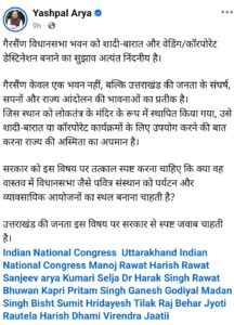 गौरतलब है कि मंगलवार को कैबिनेट मंत्री सतपाल महाराज का एक वीडियो वायरल हुआ था जिसमे उन्होंने पर्यटन विकास के लिए गैरसैंण विधान सभा को वेडिंग डेस्टिनेशन सहित अन्य उपयोग की बात कही थी। इसे लेकर कांग्रेस ने विरोध जताया और कहा कि गैरसैंण जन भावनाओं का प्रतीक है। कांग्रेस अध्यक्ष ने भी इसे भाजपा की सोच बताया।