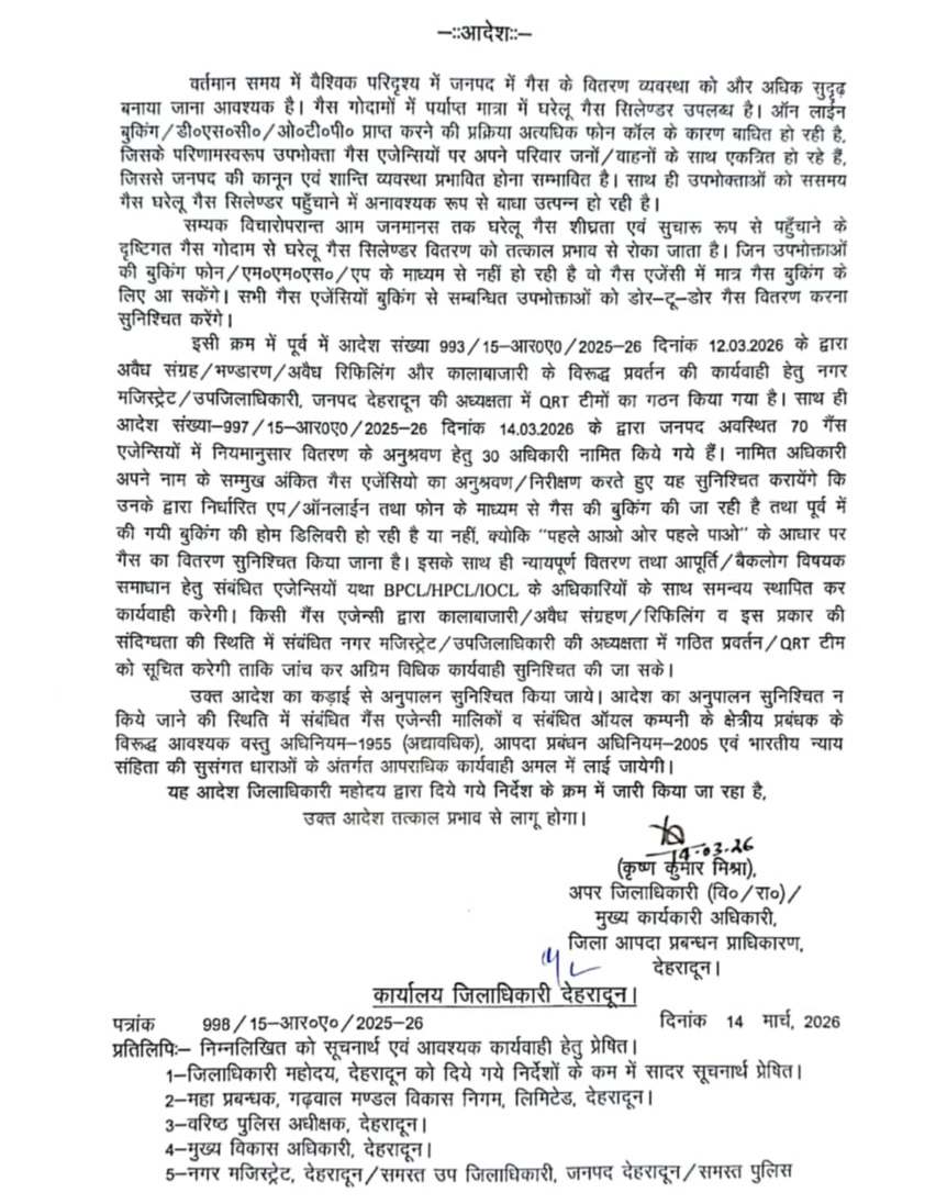 देहरादून। गैस की कालाबाजारी रोकने को जिलाधिकारी ने क्यूआरटी गठित कर दी है। इसके लिए 30 अधिकारी नामित किये गए है। अब एलपीजी गैस केवल होम डिलीवरी से ही मिलेगी। अब गैस एजेंसी से सीधे उपभोक्ता को सिलेंडर वितरित नहीं होंगे। प्रशासन ने एजेंसी को प्रशासन के सख्त निर्देश दिये हैं। गैस एजेंसी को डोर-टू-डोर गैस वितरण करनी होगी