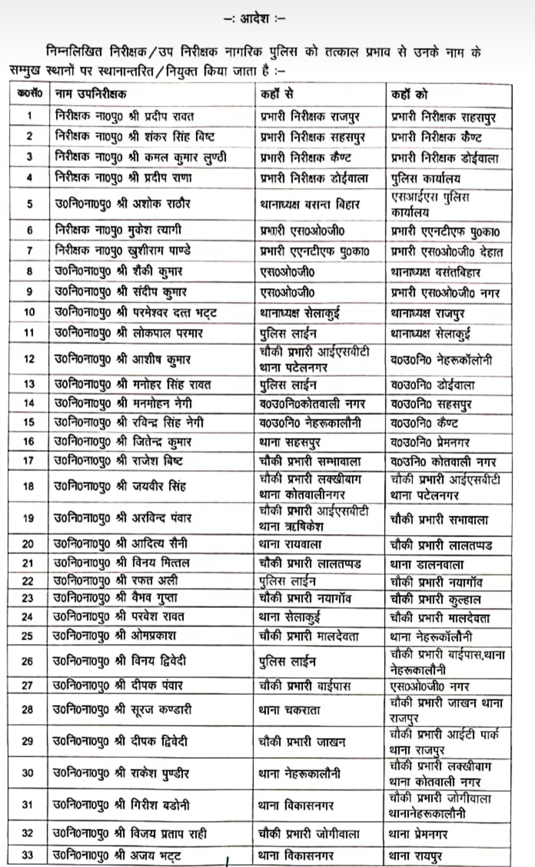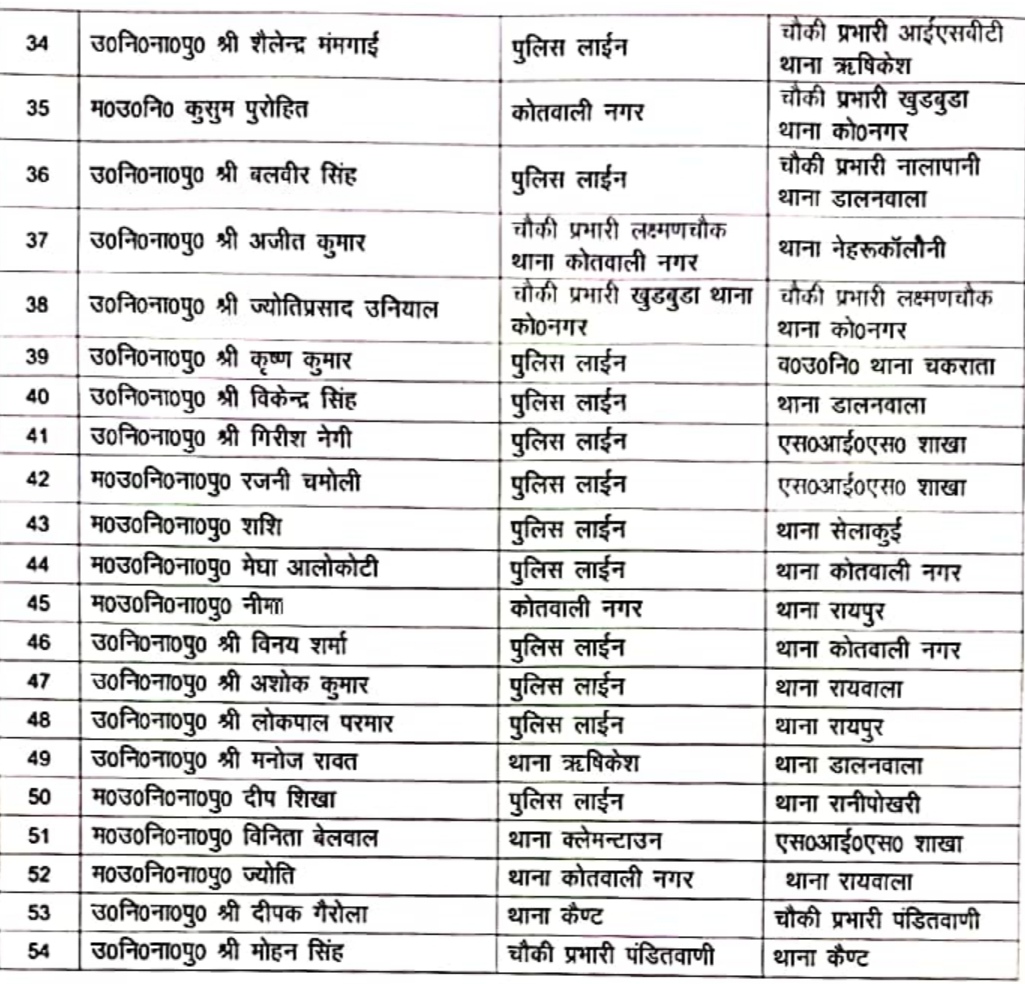 देहरादून। नये कप्तान प्रमेंद्र डोबाल ने देहरादून जिले के कई पुलिस कर्मियों के ट्रांसफर किये हैं।