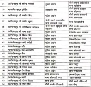 54 इंस्पेक्टर और दरोगाओं के तबादले किये गए है। इसमें अधिकतर थाना और चौकी प्रभारी बदले गए हैं। सूची मे 6 इंस्पेक्टर, 40 दरोगा तथा 8 महिला  दारोगा शामिल हैं।