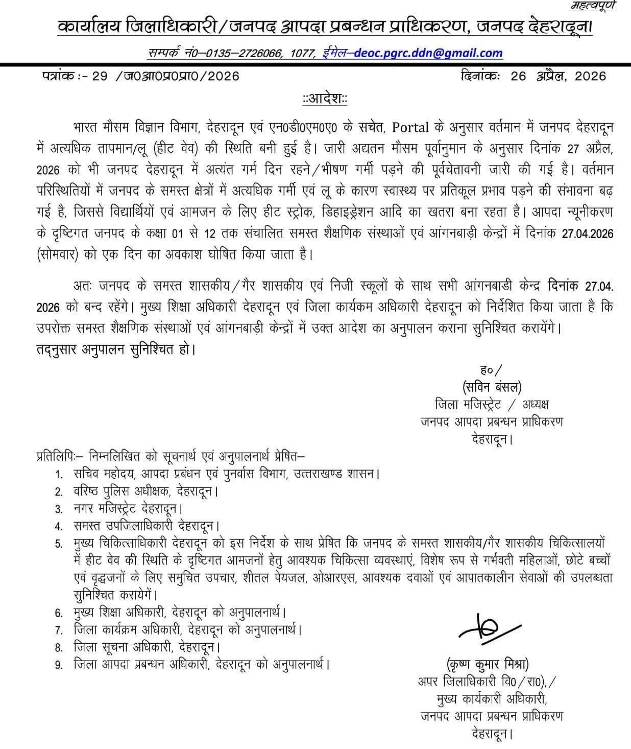 मौसम विभाग द्वारा भीषण गर्मी की पूर्व चेतावनी को देखते हुए जिलाधिकारी देहरादून सविन बंसल ने सोमवार 27 अप्रैल को एक दिन का अवकाश घोषित किया है। देहरादून में शायद यह पहला मौका है जब भीषण गर्मी की चेतावनी के बाद एहतियातन स्कूलों की एक दिन की छुट्टी घोषित की गई है।